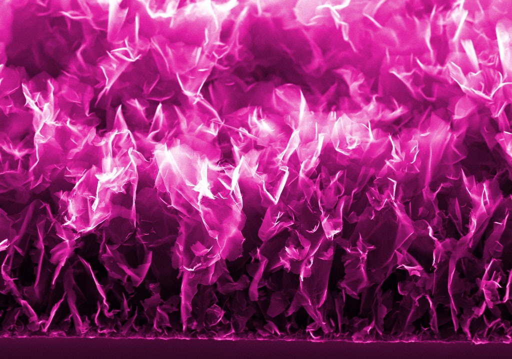 Изображение. Окрашенный снимок углеродных наностенок, полученный на сканирующем электронном микроскопе. Углеродные наностенки, или вертикально ориентированные графеновые слои, можно использовать, например, для изготовления электродов суперконденсатора — устройства, которое запасает и высвобождает энергию быстрее, чем батарея. Источник: Станислав Евлашин